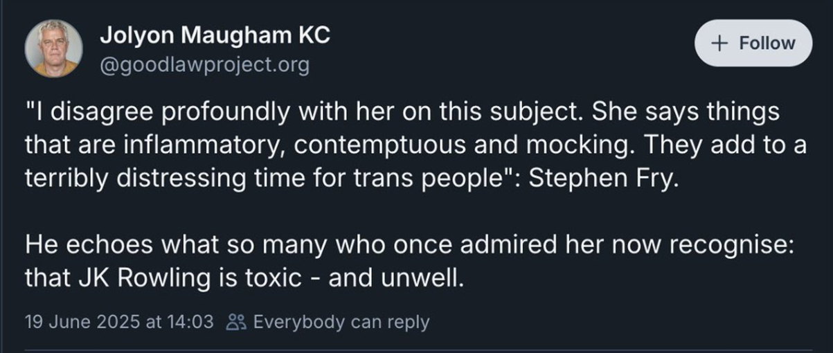 The heroic and handsome human rights lawyer Jolyon Moron has led the way by describing Rowling as ‘unwell’, a tactic never before used to question a woman’s sanity.