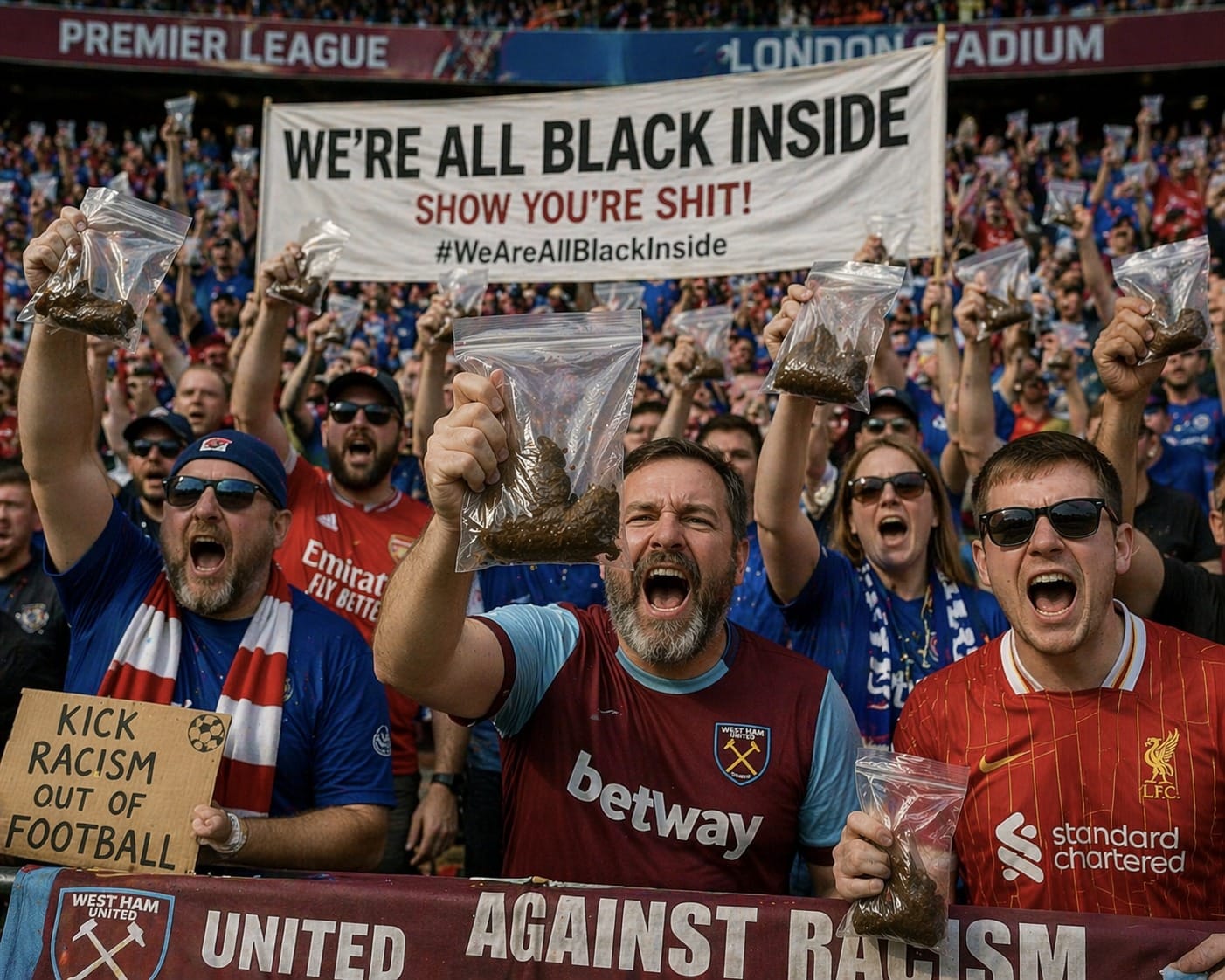 The “show you’re shit” campaign, the global anti-racism phenomena which succeeds the previous anti-racism phenomena “take the knee” has achieved unanimous support from within the ranks of British football.