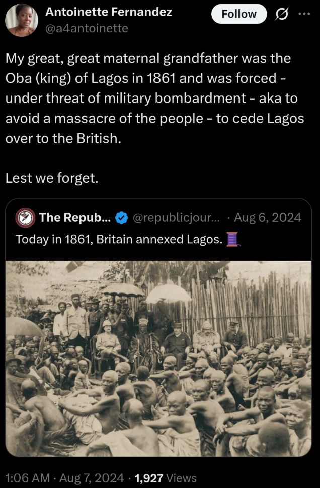 "The actions of the infamous 'West African Squadron' fatally disrupted my ancestors thriving human logistics operation, just as they were on the brink of scaling. The actions of the Royal Navy put my family into poverty, with the rest of the people they had governed"